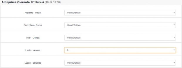 Sarà sufficiente lasciare tutto inalterato, ossia con l’opzione “voti effettivi” per tutti i match, tranne per Lazio - Hellas. 3 le possibilità di scelta relative al voto d’ufficio: 5, 5.5 e 6 (per tutti i giocatori compreso infortunati e squalificati). Naturalmente, è bene concordare in anticipo la propria opzione di scelta, già in sede regolamentare, in modo tale da evitare situazioni di arbitrarietà nel bel mezzo della competizione.